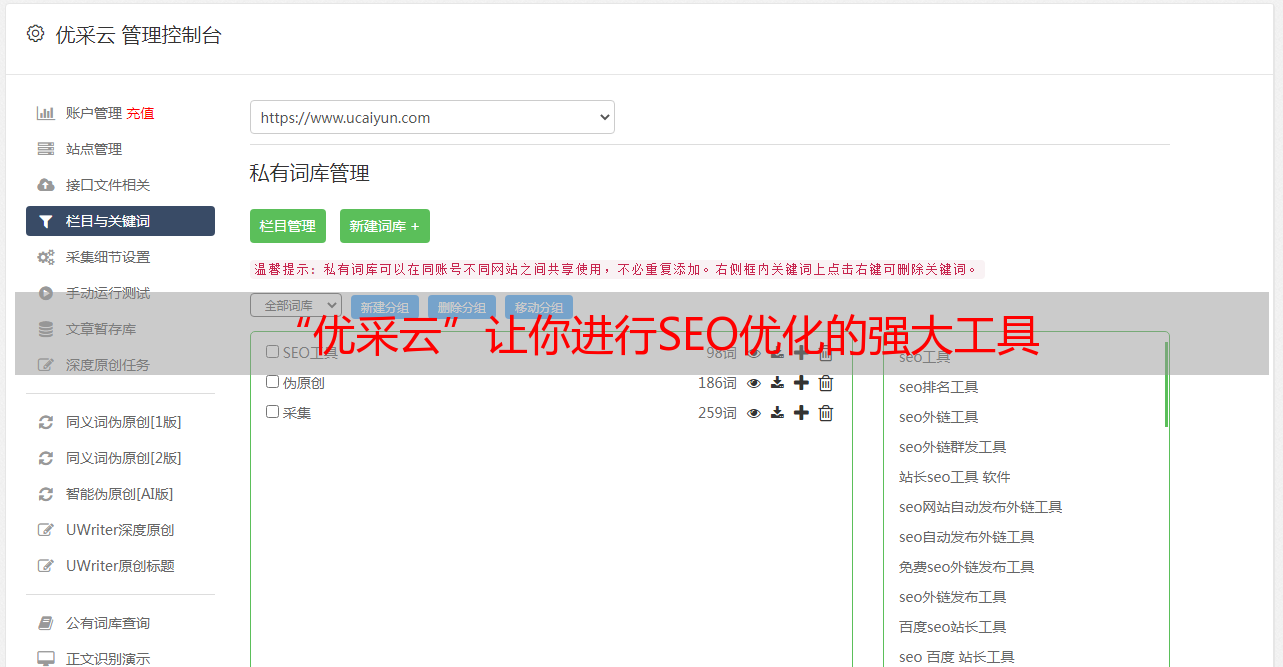 总之,“优采云”是一款卓越而强大的SEO工具,无论是对于SEO优化者还是对于SEO开发者都有很大帮助。如果你想要尝试一下这款神奇而又能带给你惊喜效果的工具,不妨上www.ucaiyun.com去看看吧~