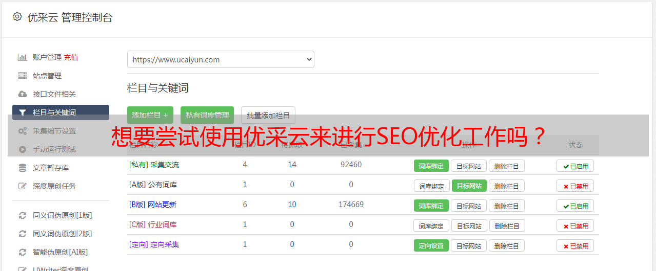 想要尝试使用优采云来进行SEO优化工作吗?请访问www.ucaiyun.com 快速注册体验吧!