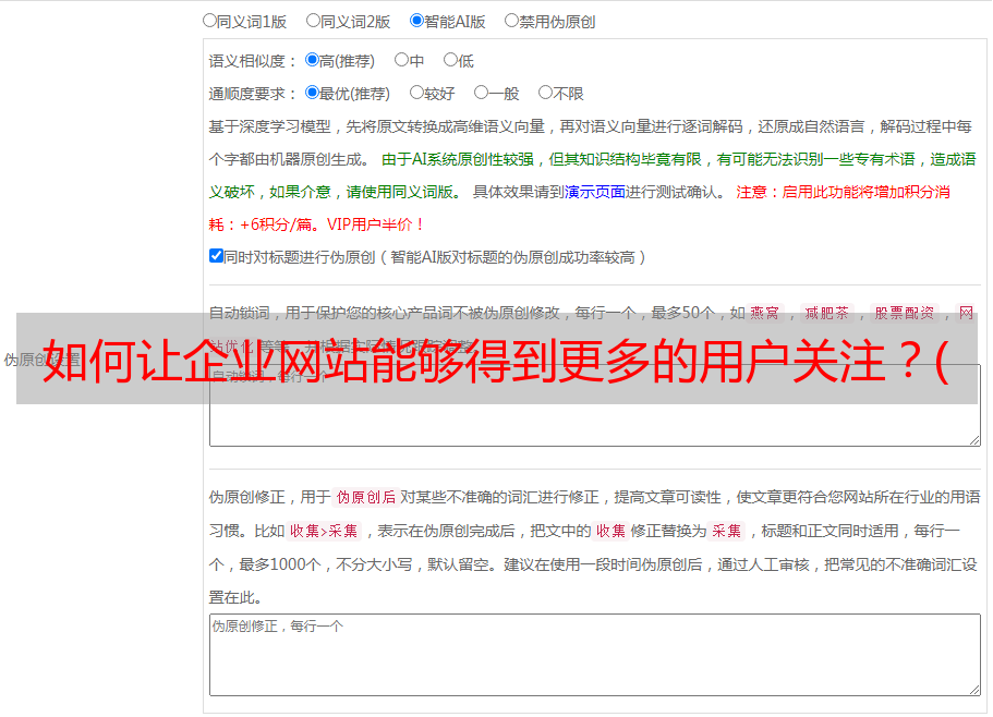 首先,要想让企业网站得到更多人关注,就必须加强网站内容的原创性。原创文章不仅可以表明企业独特性,还能够吸引读者,还可以通过SEO技术帮助网站排名。目前,很多企业都在努力寻找原创文章来宣传自己的产品和服务。不过,要想写出一篇能够引起读者兴趣并能够有效宣传的文章并不是一件容易的事情。