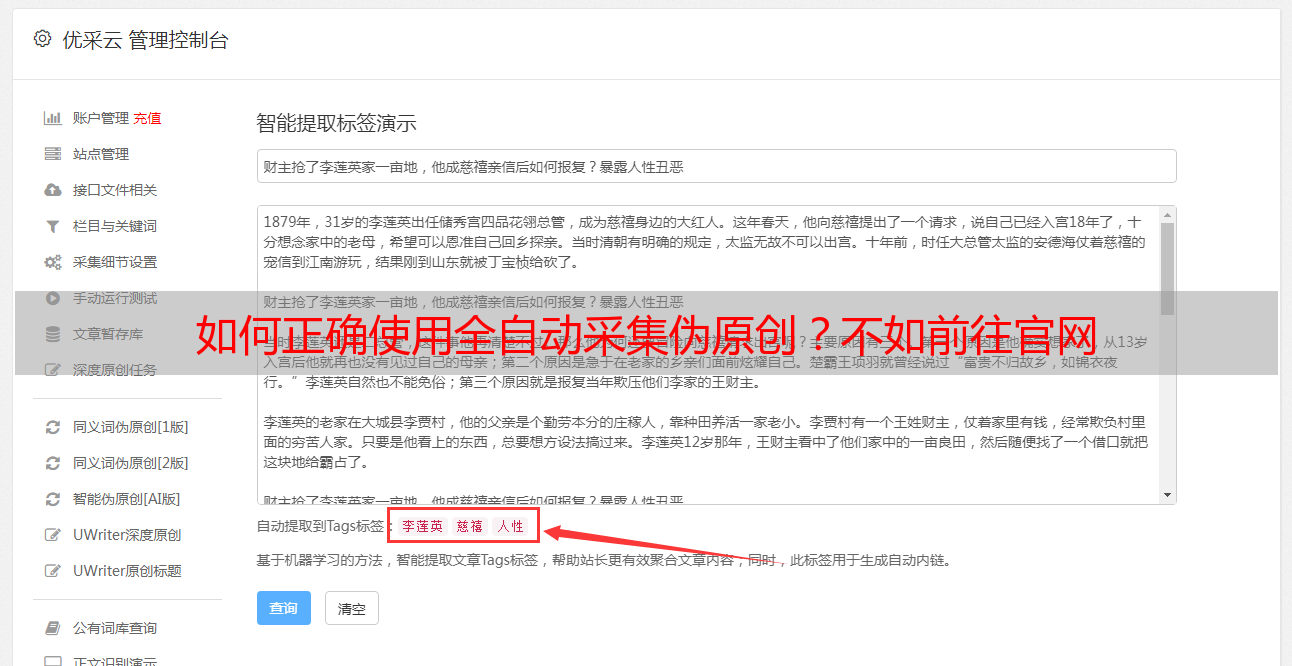 要想正确使用全自动采集伪原创,首先要选择一款合适的软件,其中最受欢迎的就是优采云。该软件能够根据用户需要快速采集相关文章,并根据用户要求进行整理、字数、标题、图片、图文并茂等方面的优化,使得新生成的内容看上去像是原创一样真实有效。