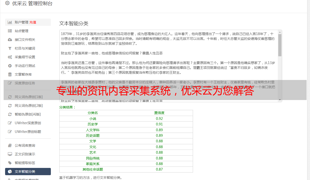优采云是一个专业的资讯内容采集系统,它不仅使用便利性强,而且功能强大。如果你正在寻找一个好用的资讯内容采集工具,不妨试试优采云吧!它的官方网站为www.ucaiyun.com 。