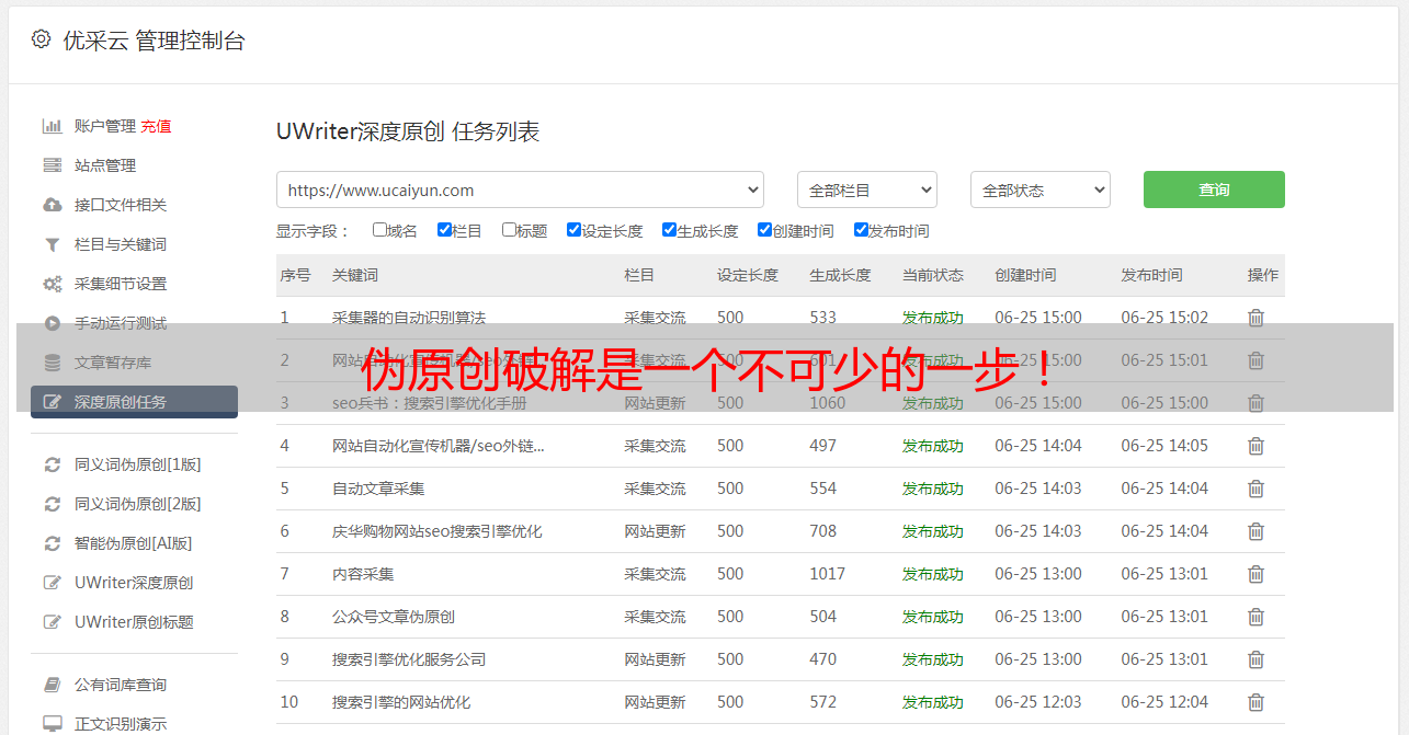 总之,伪原创破解是一个不可避免的步骤。如今市场上出现了一款专业的伪原创软件——优采云(www.ucaiyun.com),既能实现快速而准确的伪原创效果,也能进行SEO 优化,省却了大量时间和人力成本。因此,使用者可以依托此工具将文章写作时间大幅度减少!