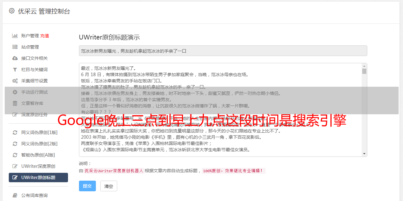 关于网站内容更新NO1文章发布频率的8条提示。如果网站以前平均每天发表一篇文章文章如果要增加网站发表的数量,也应该逐渐增加发表的数量,而不是在短时间内从一篇文章文章跳转到数百篇文章所以搜索引擎会认为网站不正常认为网站在采集会看网站短时间内网站排名快照更新网站收录 会受到影响。 NO2 每个页面的标题和描述必须不同。 网站很多,为了增加网站页面的数量,对网站文章做分页处理是很好的但是在处理文章的时候一定要注意每个页面的文章 对应一个页面。这些页面的标题不能相同。搜索引擎不喜欢重复的标题。如果整个网站重复的标题太多,不给网站反而给网站带来好处。 NO3 内容发布技巧也要考虑时间问题。谷歌下午3点到早上9点之间是搜索引擎蜘蛛爬取网站内容最频繁的时间百度爬取更频繁,尤其是它最喜欢的网站,每天爬取速度都非常快如果网站能怎么办每天可以发很多文章文章search engine收录什么篇文章 那么网站的情况应该是相当不错的,所以你发文章的时候应该等搜索引擎更新了再发经常或在更新时间前发布,让当天发布的内容让搜索引擎尽快走收录NO4字数更多文章