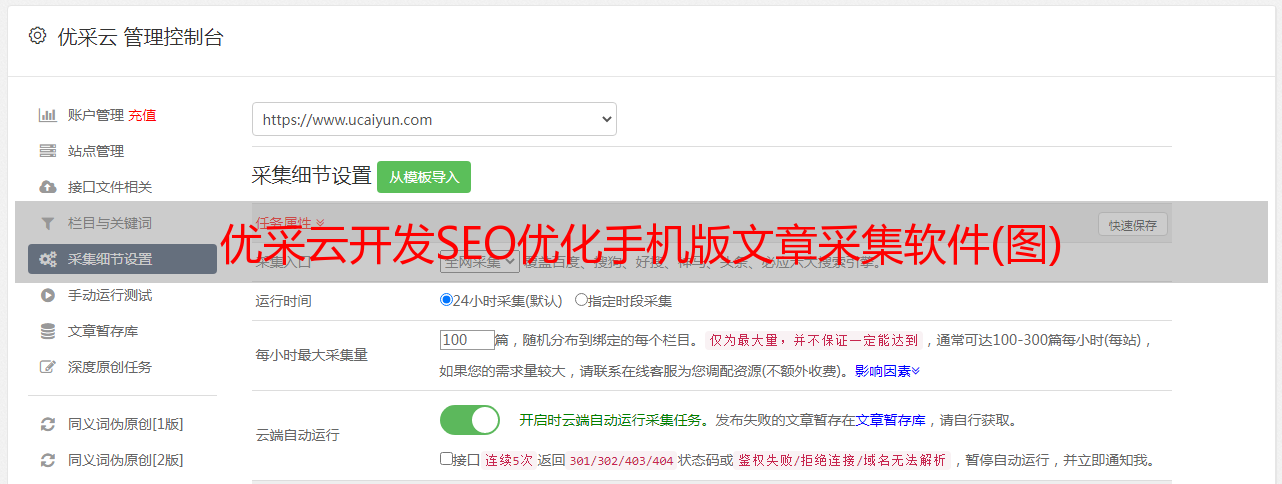总而言之,优采云是一款强大的SEO优化的手机版文章采集软件。它不但能够帮助企业高效地将信息快速采集到各大平台上;而且还能够根据SEO要求对内容进行优化、存储信息、分享到各大社交平台、监测用户行为等。如果你想要尝试使用该软件来帮助你的商业运作效率和效益得到明显提升,不妨去优采云官网www.ucaiyun.com上看看吧。