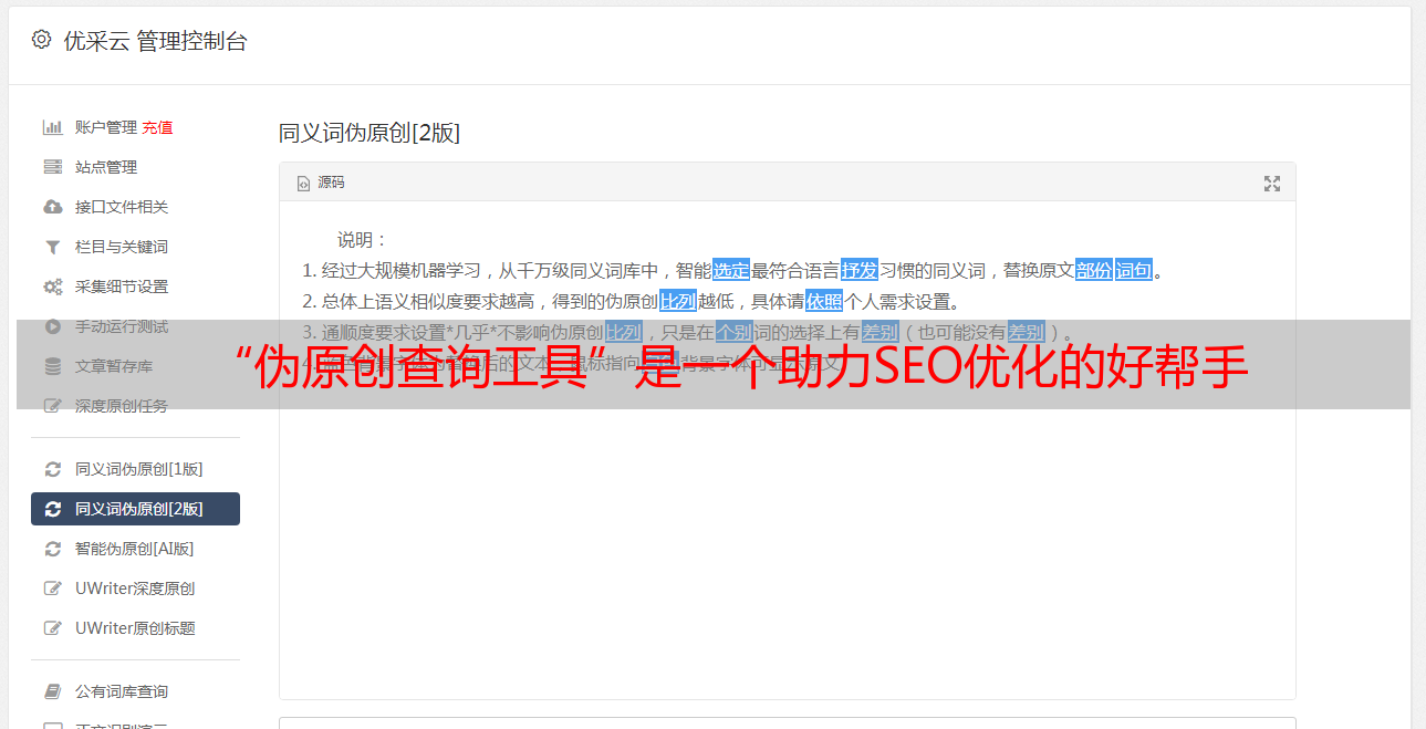 总之,“伪原创查询工具”是一个助力SEO优化、内容创作、文章审核的好帮手。如有需要,可前往官网www.ucaiyun.com 了解详情。