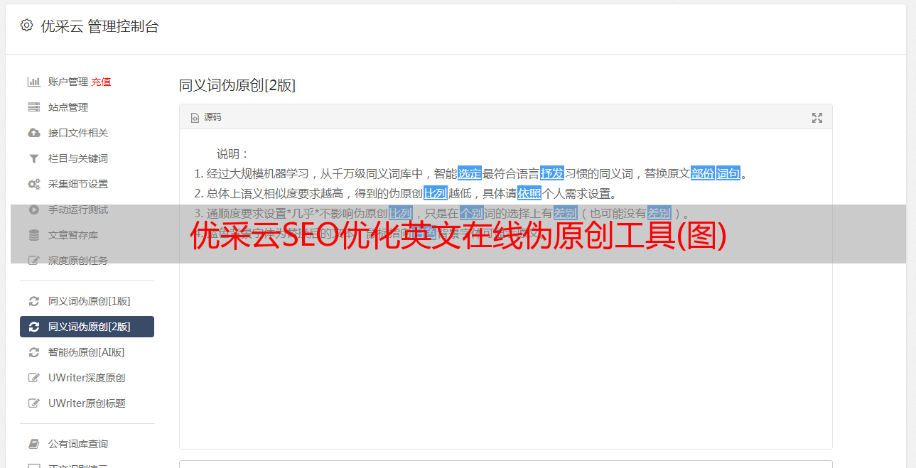 如此强大而丰富的功能,使得“优采云”SEO优化英文在线伪原创工具显得尤为重要。此外,该工具还可以与Google、Bing和Yahoo!相连接,并提供一些额外的服务:例如正确标注权重、有效地将相关信息向Google、Bing和Yahoo!发出信号、对Web站点进行性能测试。无论是SEO优化还是内容生成方面都能得到卓越表现。