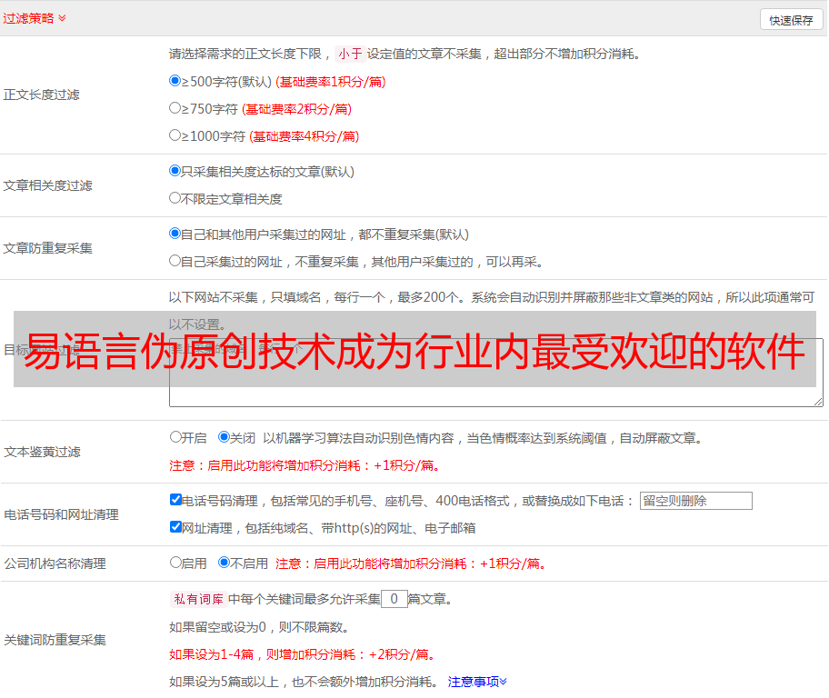 如今,优采云的SEO优化软件已经成为行业内最受欢迎的软件之一。该软件不仅可以帮助用户快速找到合适的关键词,而且能够实现易语言伪原创功能。用户只需要将原始文章复制到该软件中即可实现易语言伪原创,而无需手动进行信息替换。此外,由于该软件采用了AI人工智能技术,因此能够在保留原有思想的前提下实现对文章内容的全面优化。