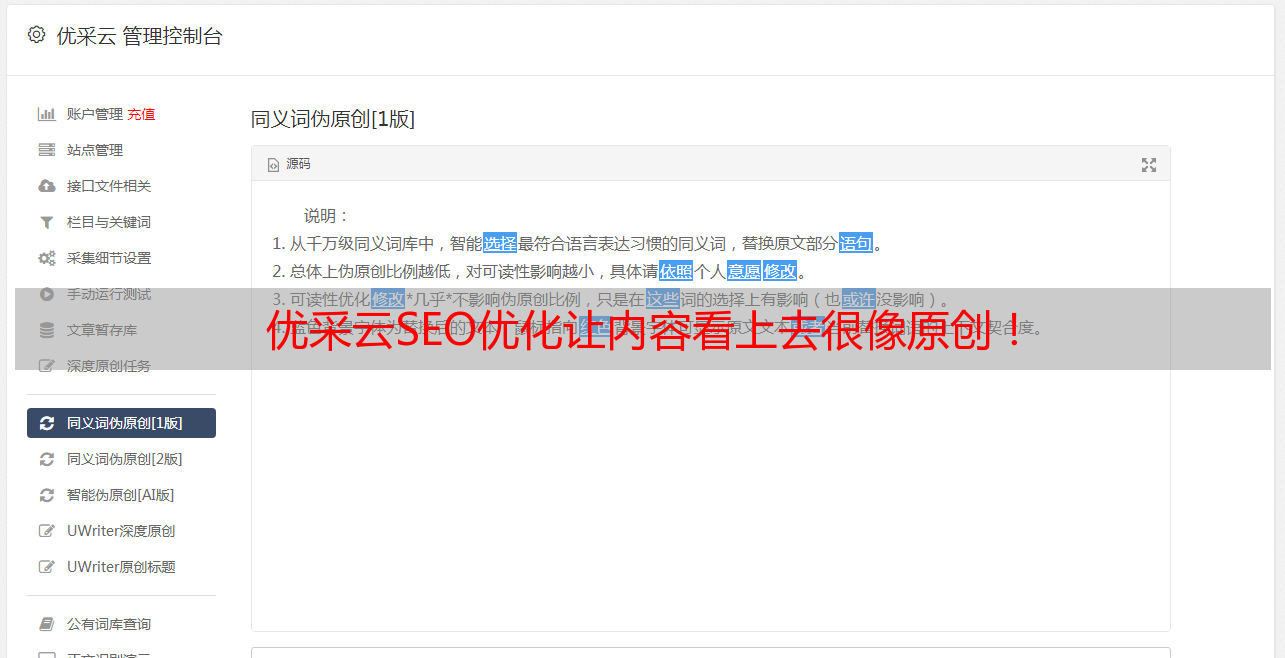 在这样的背景下,优采云SEO优化就应运而生,它是一款全新的在线伪原创工具,可以帮助用户快速生成大量文章。它采用机器学习来解决文章重复问题,并使用语义理解等多元化方式来生成新内容,可以帮助用户更好地进行SEO优化。
