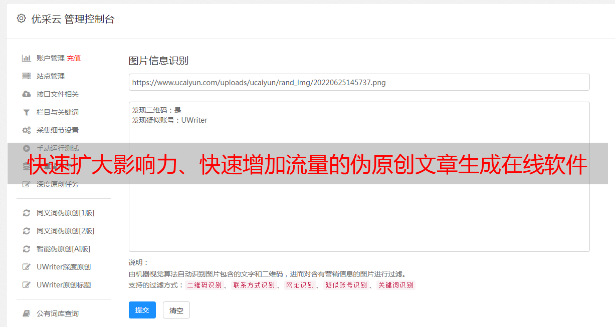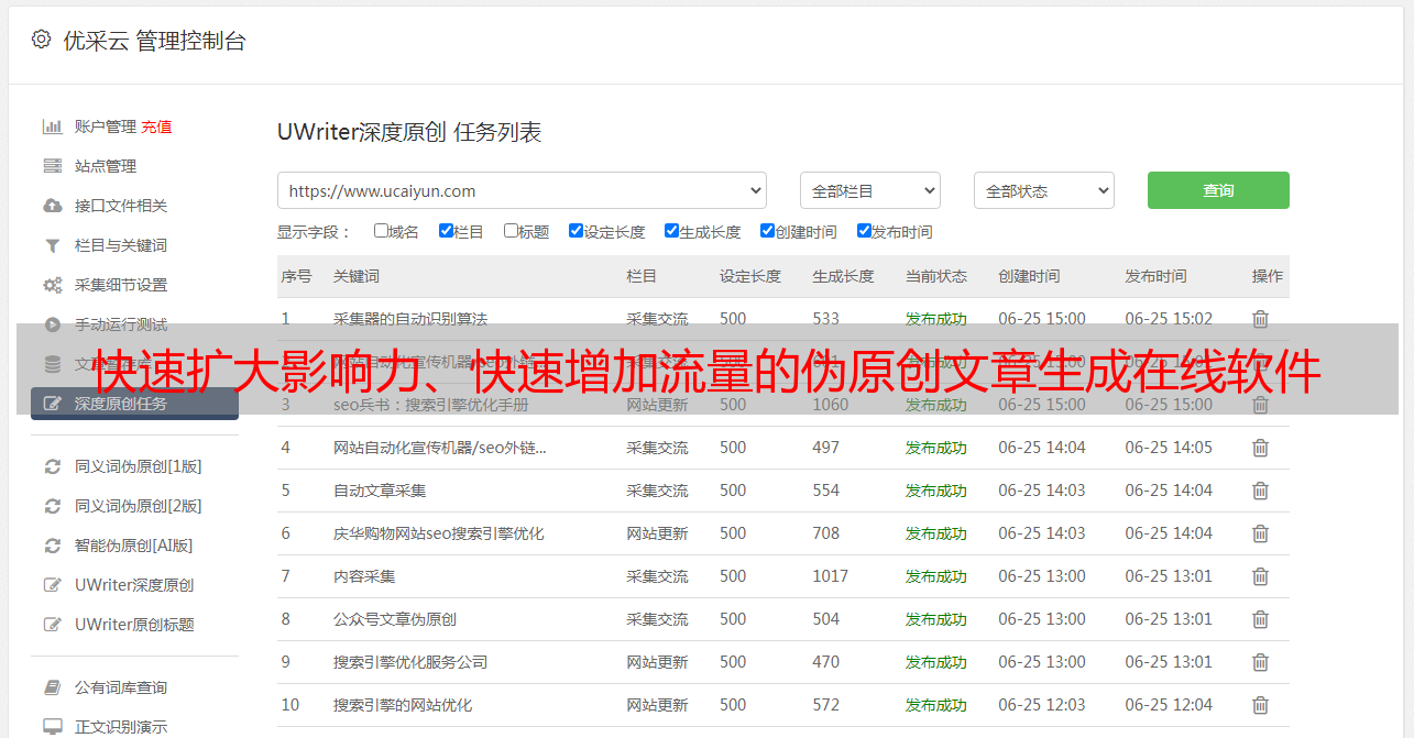 总之,优采云是一款强大而易用的伪原创文章生成在线软件,通过它能够将企业内容市场营销实现一步到位。如果你想快速扩大影响力、快速增加流量,就不妨使用它来帮助你实现目标。它的官方网站www.ucaiyun.com上也有详尽的使用说明和产品特性介绍供你参考,快来看看吧~
