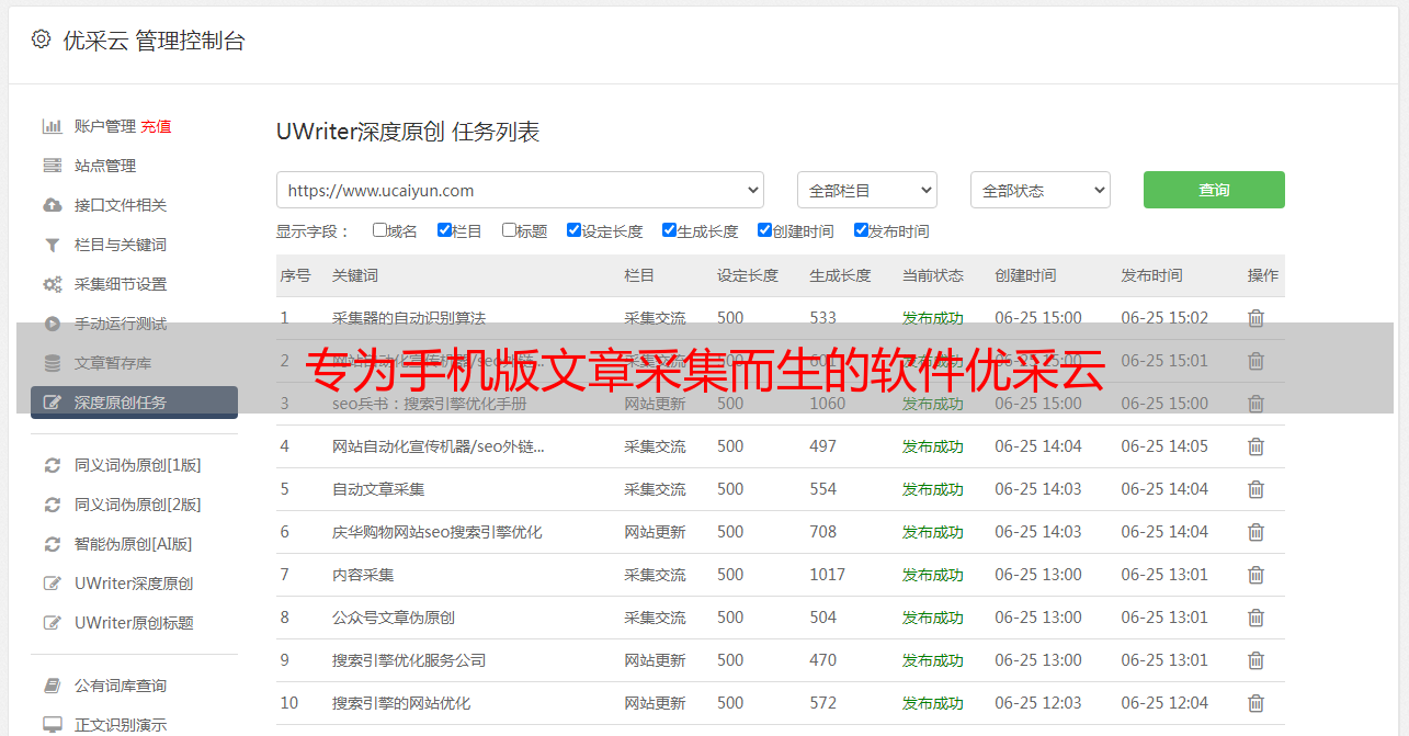 总之,优采云是一款专为手机版文章采集而生的软件,它具备强大的采集能力、SEO优化功能、一键分发功能和内容整合、内容分析、流量监测、数据分析等功能。如果你想要快速准确地寻找有价值的信息来进行SEO优化,请使用优采云——www.ucaiyun.com 。