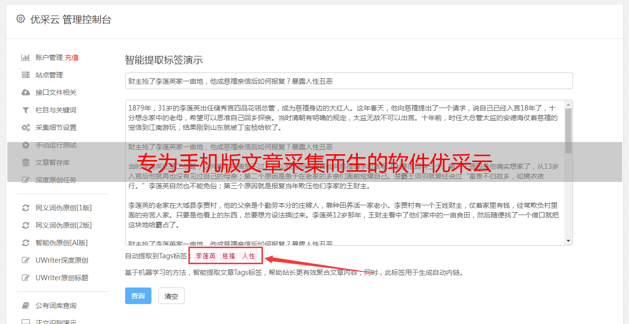 优采云的功能强大而且易用,它可以帮助企业快速收集手机版文章,不仅能收集标题、正文、图片等内容,还可以根据关键词进行精准的信息采集。此外,优采云还具备爬虫能力,可以快速抓取各大门户类、论坛类、商城类、博客类、新闻类等信息。