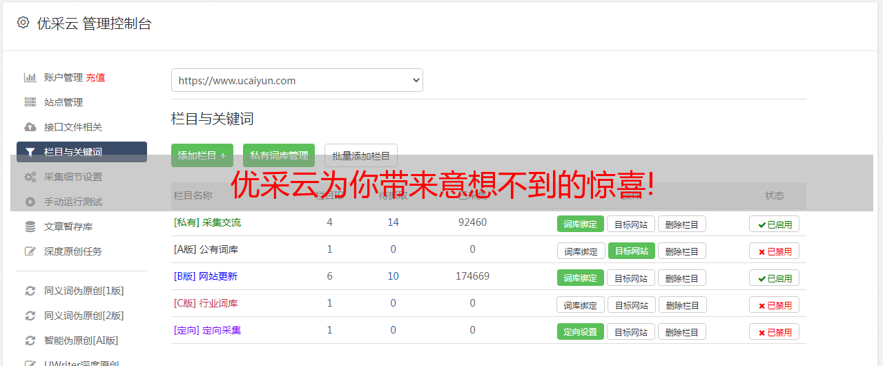 总之,优采云是一款功能强大、易于使用的资讯内容采集系统。它不但可以快速、准确地实现信息采集和SEO优化;而且还能够帮助用户将所有已采集内容存储在云端中;此外,优采云还能够使得用户随时都可以随时检索和使用所存储的内容。如果你想要一套强大、易于使用的资讯内容采集工具,不如就来试试优采云吧!如想要详情请浏览 www.ucaiyun.com 它将为你带来意想不到的惊喜!