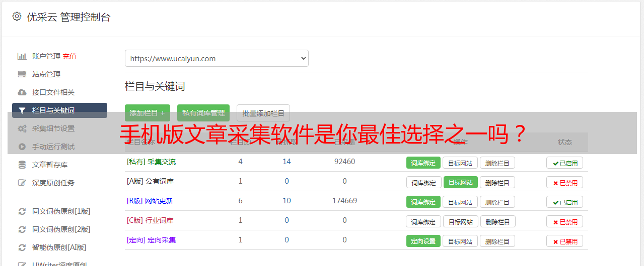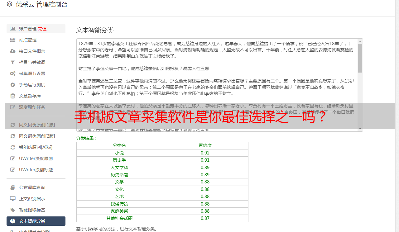 优采云是一款非常实用的手机版文章采集软件,它可以帮助用户快速、高效地采集手机网站上的文章内容。用户可以根据自己的需要,设置不同的采集规则,便于对采集到的内容进行分类和处理。此外,优采云还具备强大的SEO优化功能,可以帮助用户将文章内容在搜索引擎中排名提升,进而提高网站流量。