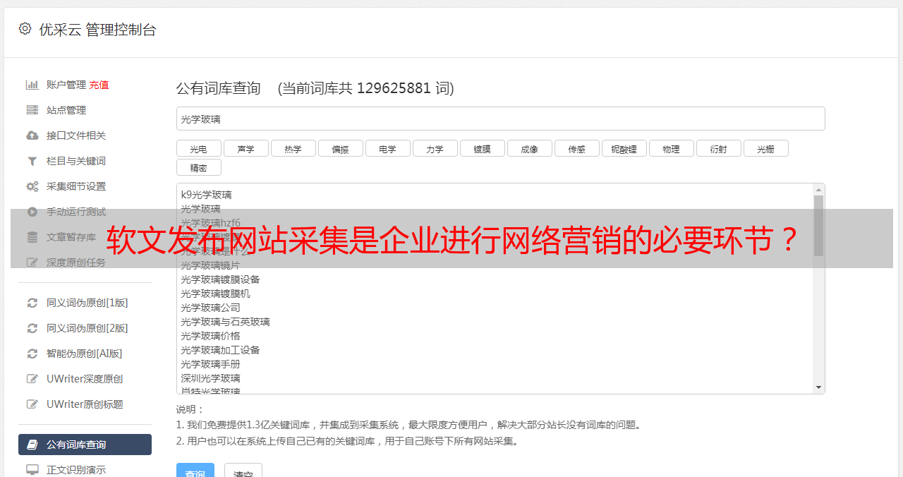 总之,优采云是一款集内容采集、SEO优化以及多媒体存储于一体的工具。它能够帮助用户快速有效地从多个软文发布网站中获取内容,并将内容及时准确地发布到各大平台上。如果你想尝试使用该工具来进行营销工作,不妨上www.ucaiyun.com看看吧!