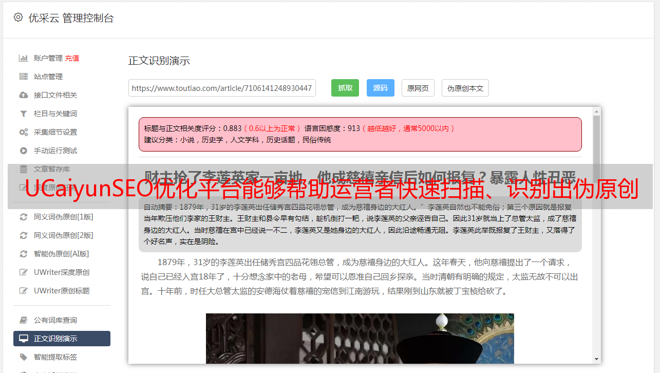 UCaiyunSEO优化平台能够帮助运营者快速扫描、识别出伪原创内容