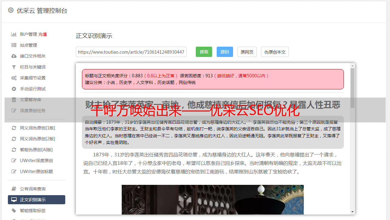 总之,文章采集是一种强大而有效的工具,通过它可以快速、准确地获取大量信息并进行分析处理。而优采云作为一款专业的文章采集工具,不仅能够快速、准确地帮助企业采集信息并提供SEO优化服务,还能够帮助企业通过关键字分析来识别用户喜好,并根据用户喜好来制定针对性的营销方法。千呼万唤始出来——快来体验一下www.ucaiyun.com上的神奇之旅吧!