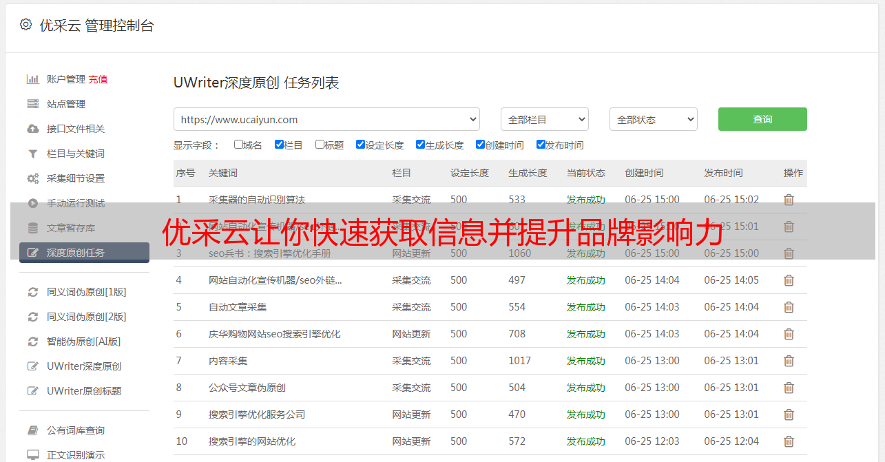 总之,优采云是一款非常方便实用的文章采集工具。它既能够快速有效地帮助用户从各大网站上快速准确地获取内容;又能够帮助用户将所获取到的内容快速地发布到各大平台上去。如果你也想找到一款好用的文章采集工具来帮助你快速获取信息并提升品牌影响力,那么不妨试试优采云吧!它将是你不错的选择。想了解更多信息请浏览www.ucaiyun.com 。