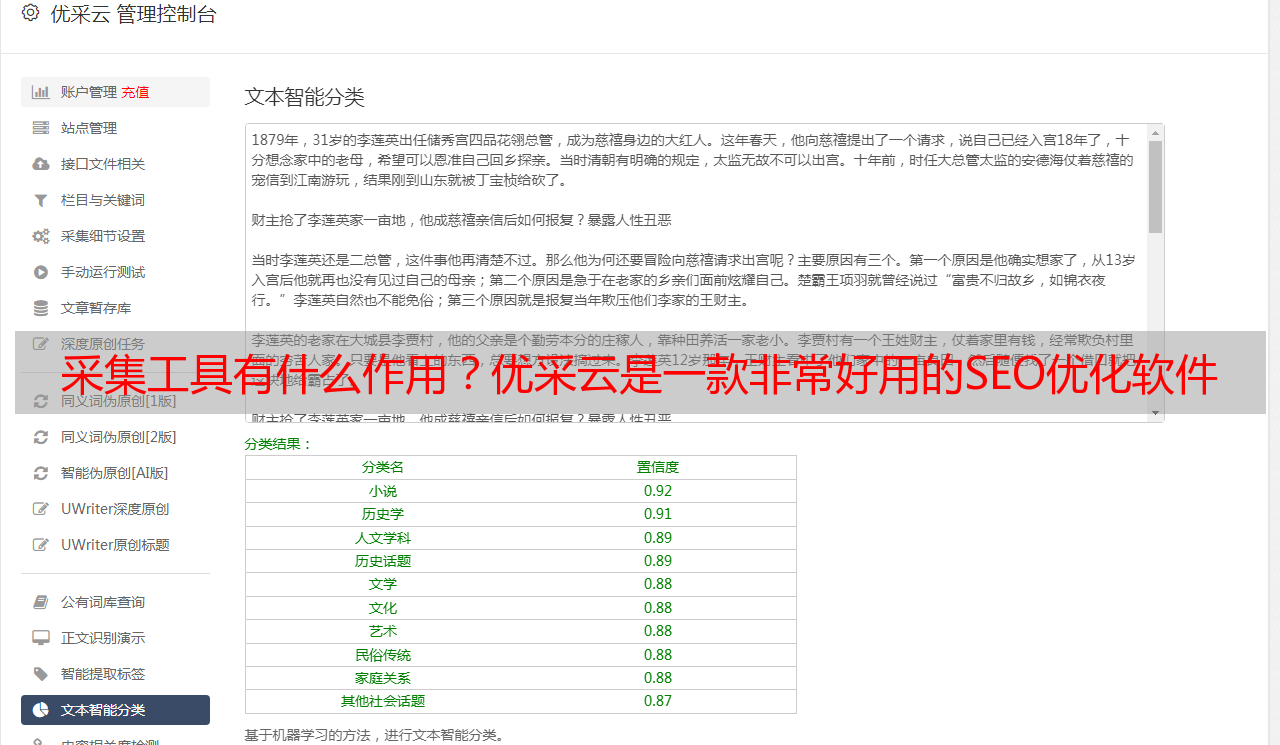 总之,优采云是一款非常好用的SEO优化软件,它能够帮助用户快速从互联网上搜集大量信息、分析数据并对文章进行SEO优化、生成内容、将内容转化为PDF文件等。如有需要可以前往官网www.ucaiyun.com 了解详情。