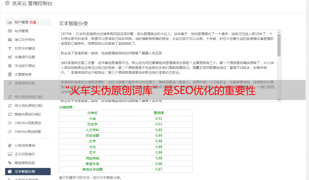 优采云 发布时间: 2023-01-19 09:34随着互联网的发展,越来越多的企业开始建立自己的网站,以提高企业的知名度和品牌形象。而要想让企业的网站在搜索引擎中有效推广,就必须要进行SEO优化。一般来说,SEO优化要求文章内容要有一定的原创性。但是,往往情况是,由于时间或者人力有限,很难保证文章内容能够全部原创。这时就需要使用一些工具来帮助我们生成原创性文章,而火车头伪原创词库就是其中之一。