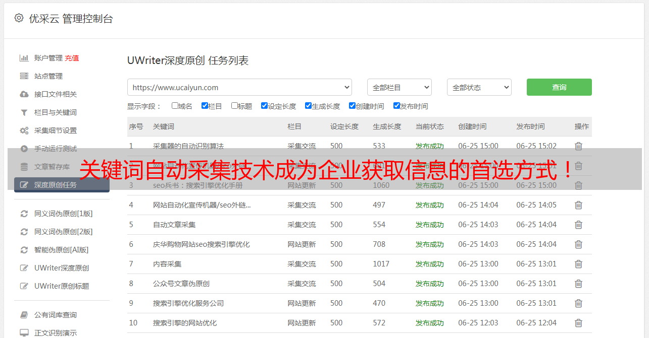 总之,使用优采云这一SEO工具可以帮助企业高效地实现关键词自动采集。它不但能够快速准确地获取相关信息,而且还能够帮助企业增强竞争力、吸引大量新客户。如想要了解更多关于优采云的信息,请浏览官网:www.ucaiyun.com 上的内容。