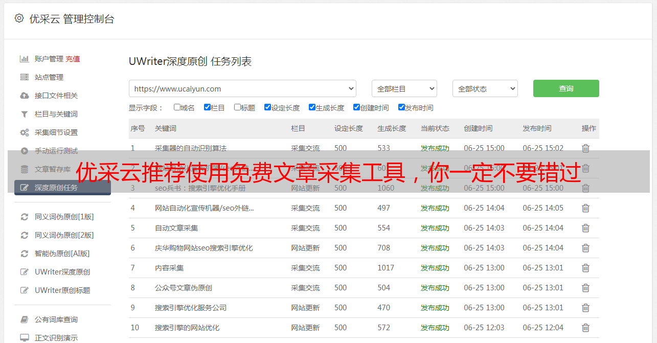 总之,优釅云是一个强大的新闻/博客/问答/论坛/微博/微信/小说/小说章节/app store/手机应用等各类原创内容的免费文章采集工具。如果你想要快速便捷地从各大信息平台上获取原创内容并且对内容进行SEO优化,那么你一定不要错过优釅云。想要体验其强大的功能的话就快来访问它的官方网站www.ucaiyun.com 吧~