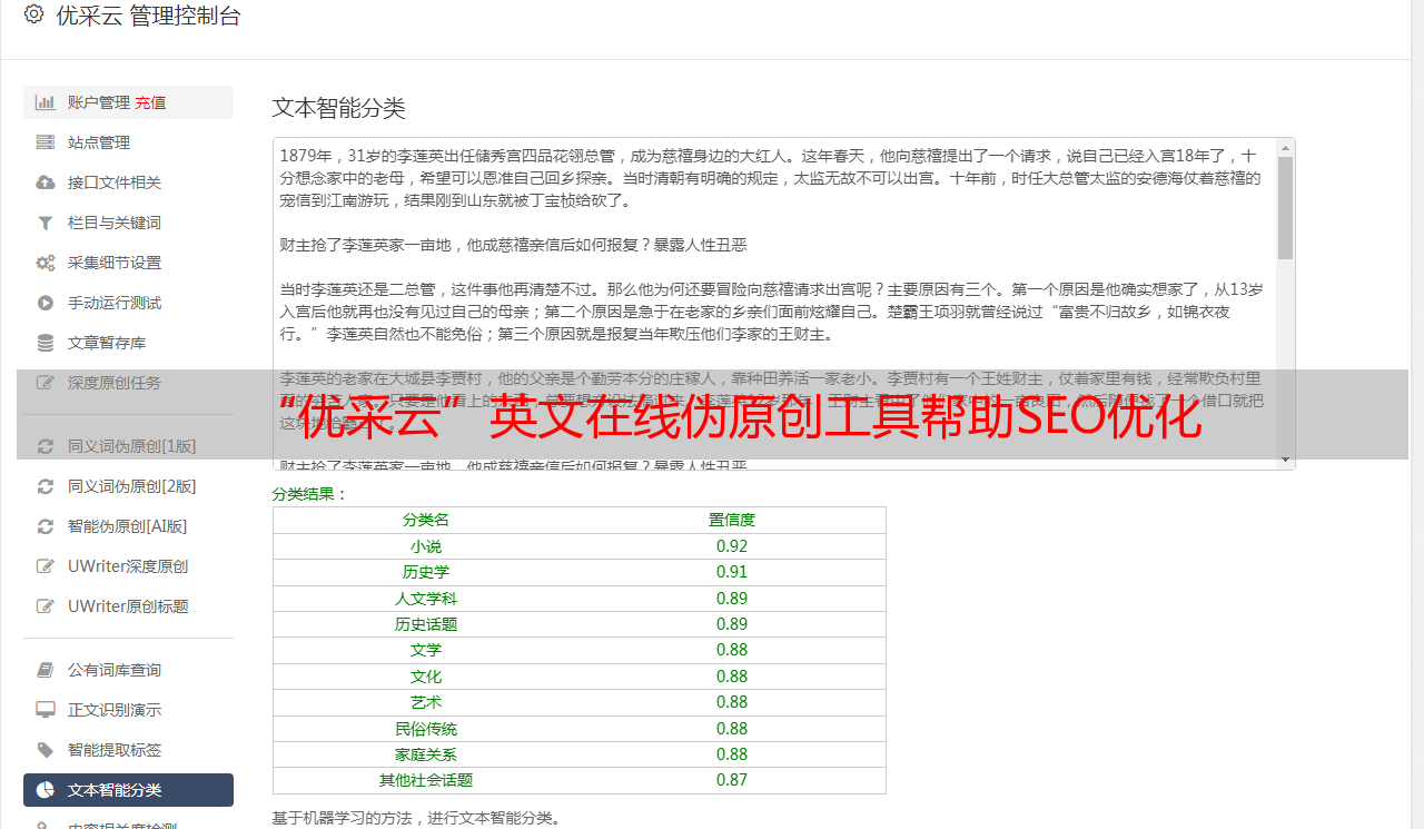 总之,“优采云”是一款集SEO优化、英文在线伪原创工具于一体的产品。它能够帮助用户快速生成内容、快速修正语法等问题,并能够对文章中的重要信息进行标注、标题进行优化。如果你想要尝试一下“优采云”的功能,可以前往它的官方网站www.ucaiyun.com 上体验一番。