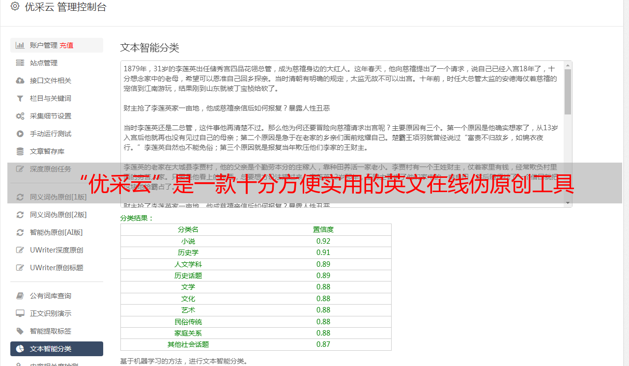 总而言之,“优采云”是一款十分方便实用的英文在线伪原创工具,它能够帮助用户快速生成高质量、SEO友好、不同风格、不同体裁和不同语言特征的文章。想要尝试使用它的朋友可以前往它的官网www.ucaiyun.com 体验一番!