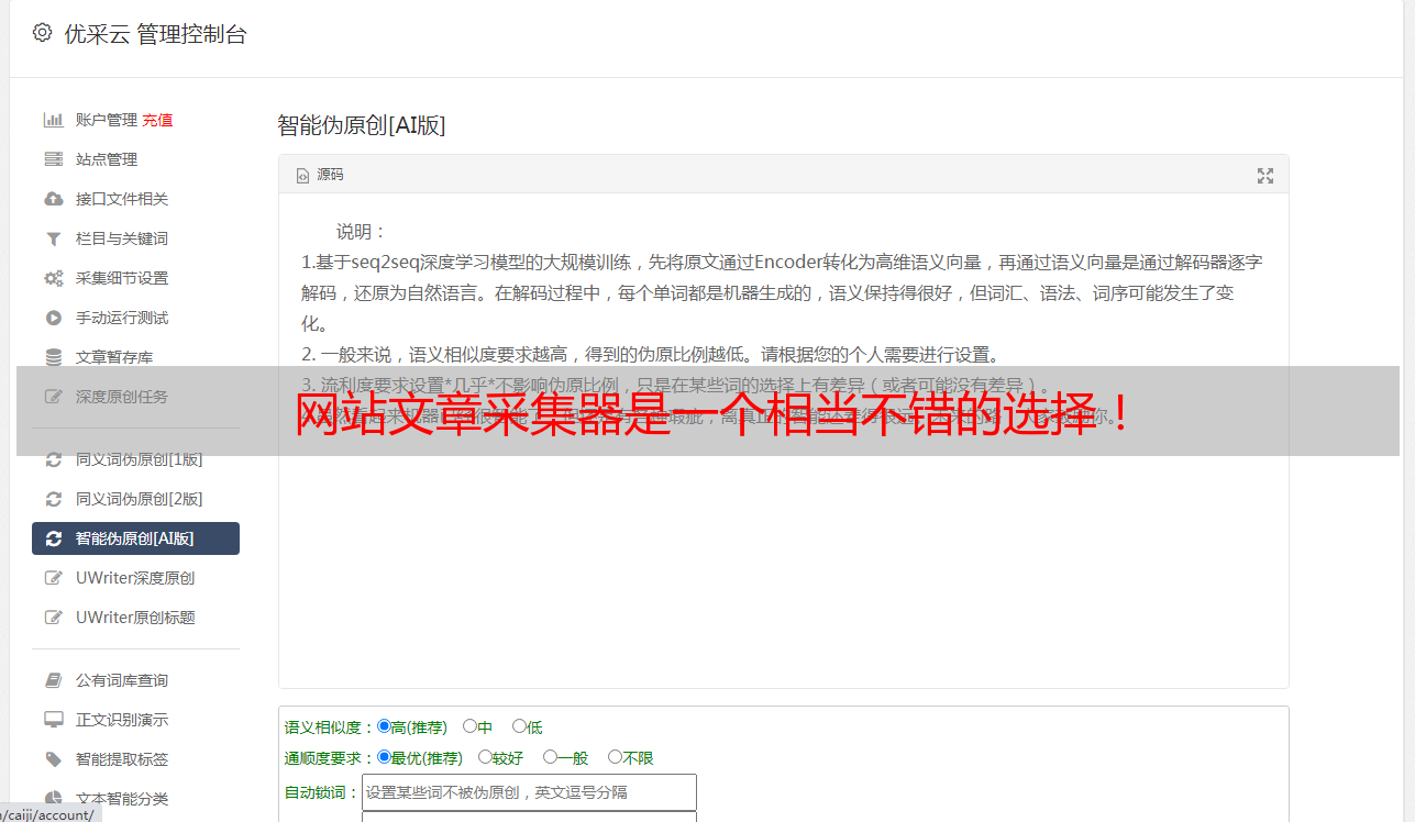 总之,优采云是一个强大而又易用的文章采集器。它不但具有强大的功能,而且性价比也很高。如果你正在寻找一个好用、性价比高的文章采集器,不妨试试优采云吧。它是一个相当不错的选择!它的官网是www.ucaiyun.com 。