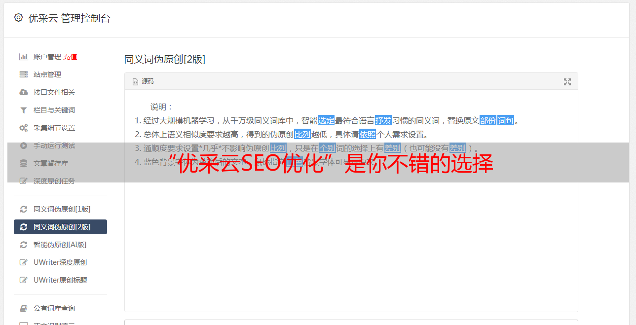 总之,“优采云SEO优化”是一款功能强大、易于使用的文章伪原创工具。如果你正在寻找一款好用的文章生成工具来帮助你快速生成高质量文章,那么“优采云SEO优化”将是你不错的选择。