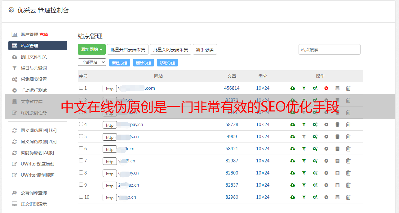 总之,中文在线伪原创是一门非常有效的SEO 优化手段。使用者如果想要快速实现此目标,就应当使用专业的SEO 优化软件——“优采云”来帮助解决问题。