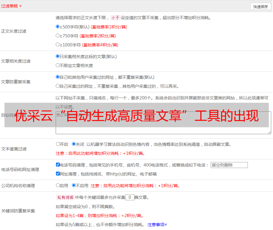优采云是一家拥有丰富经验的SEO优化公司,它专注于帮助客户利用关键词优化搜索引擎,以便在网上获得高效的流量。为此,该公司推出了一系列专业的SEO优化工具,其中最受欢迎的就是“自动生成高质量文章”。