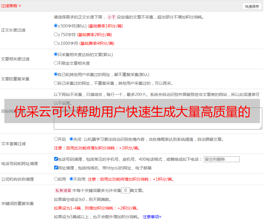 优采云可以帮助用户快速生成大量高质量的文章