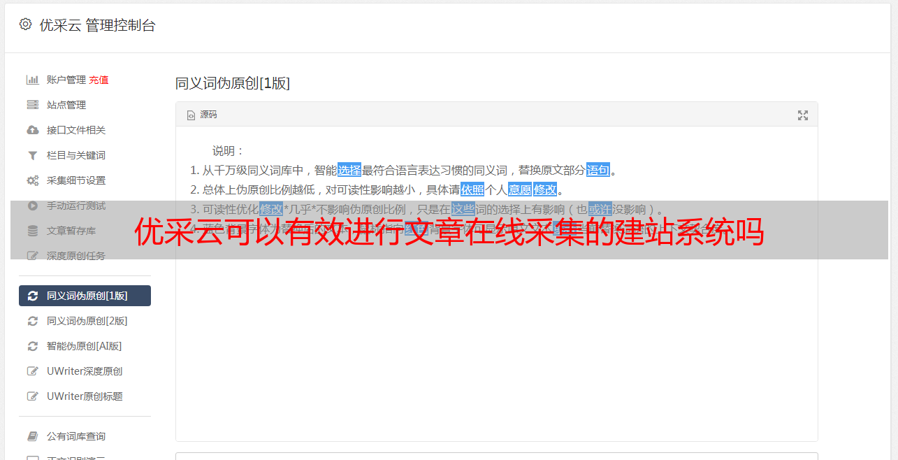 总之,优采云是一套文章在线采集功能的建站系统,既能快速准确地将各条材料归集到一起,又能够有效地帮助企业通过SEO方法将内容呈现出来并吸引相应目标用户。因此,想要获得高质量新闻和信息内容并拓展SEO效能的企业都应该考虑使用优采云——www.ucaiyun.