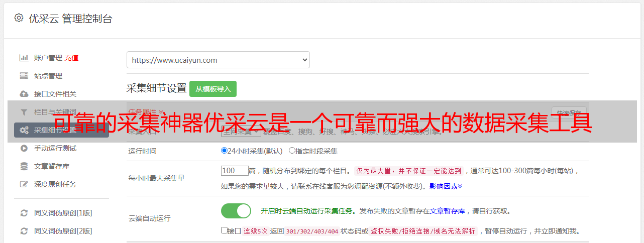 总之,优采云是一个可靠而强大的数据采集神器,它不仅能够帮助用户快速准确地采集有价值的数据,还能对图片、视频、文档等多样数据进行SEO优化和分析。如想要试用或者了解详情,请前往官方网站www.ucaiyun.com 进行注册使用即可。