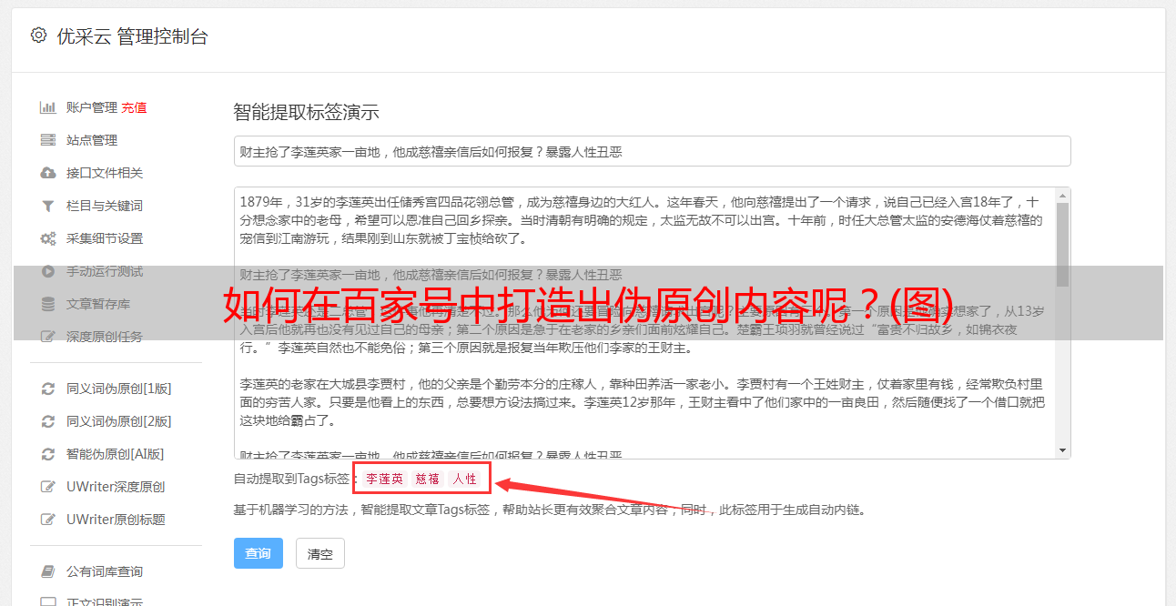 而且,优采云还能够实现文章的“半原创”和“伪原创”功能。“半原创”是将已存在的文章进行修改后形成新的文章,而“伪原创”就是将已存在的文章看上去像是一篇全新的文章。使用优采云对已存在的文章进行修改,就可以快速生成出高度独特、与市场相一致、易于理解和记忆、有助于SEO优化的伪原创内容。