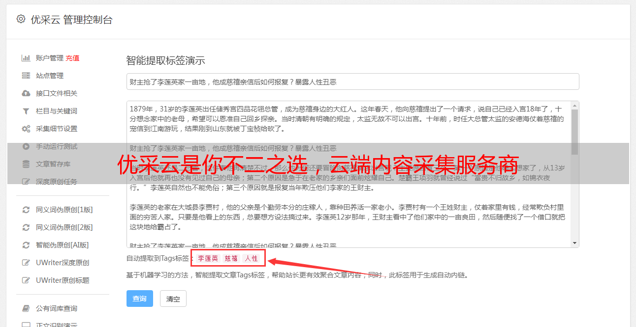 优采云是一家专注于云端内容采集的技术服务提供商,我们致力于为用户提供全面的云端内容采集服务。我们的SEO优化技术能够帮助网站用户快速获得关键词相关的内容,并将其作为网站优化的基础,从而使网站在搜索引擎中获得更好的排名。