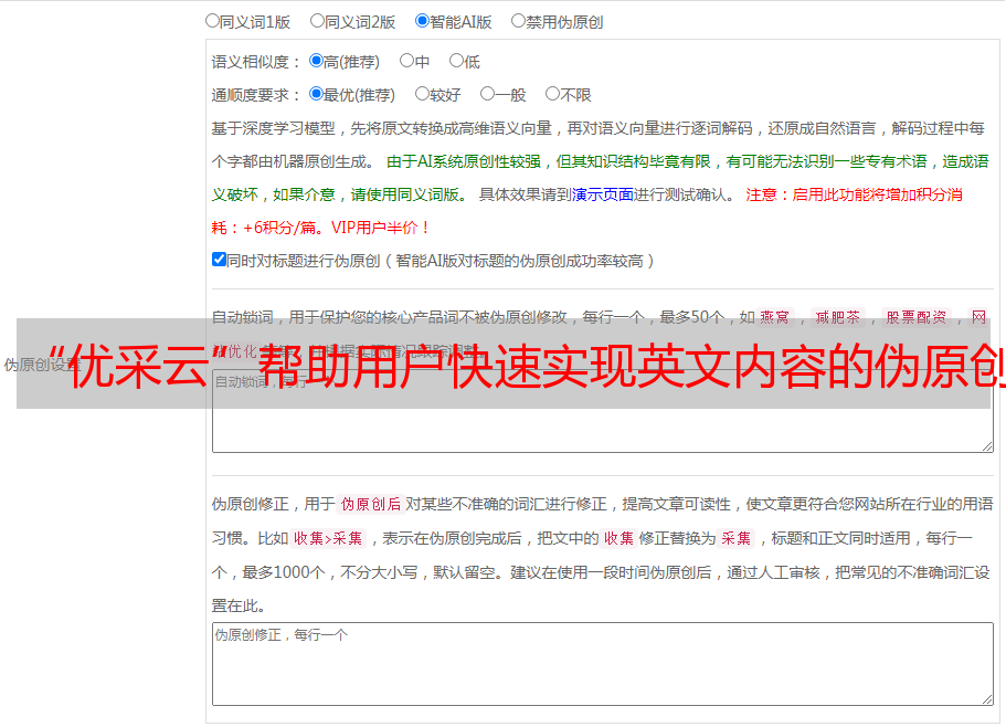 “优采云”不仅能够帮助用户快速实现英文内容的伪原创,而且还能够大大减少用户的时间和工作量。如果用户想要实现大量内容的伪原创,只需要几分钟即可实现。此外,该软件还具有强大的SEO优化功能:根据用户所选关键词对文章进行关键词密度分析和修正、根据SEO标准对文章中出现的图片、标题、尾部链接等部分进行修正。