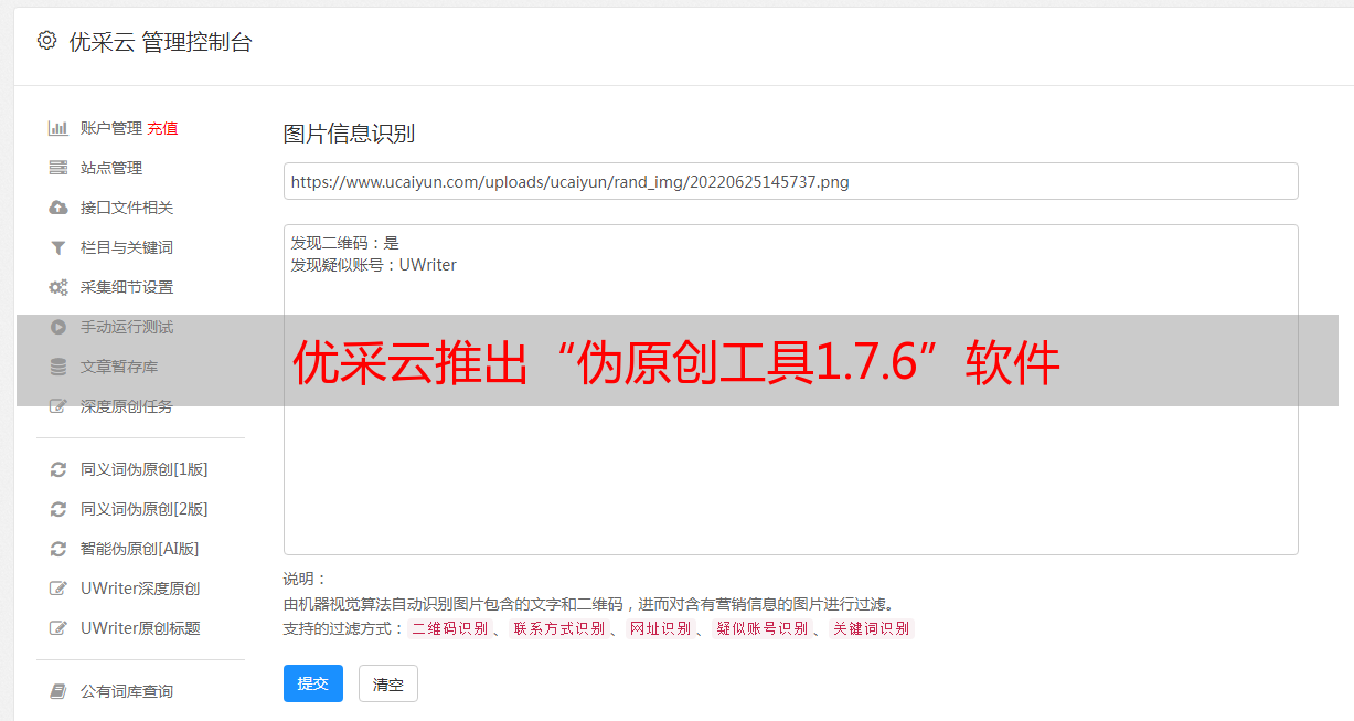 优采云 发布时间: 2023-01-25 16:40近日,优采云推出了一款叫做“伪原创工具1.7.6”的软件,该软件可以帮助用户快速生成高质量的原创内容。作为一款经过精心研发的新型伪原创软件,它可以帮助用户在最短的时间内实现伪原创,它具有如下特性: