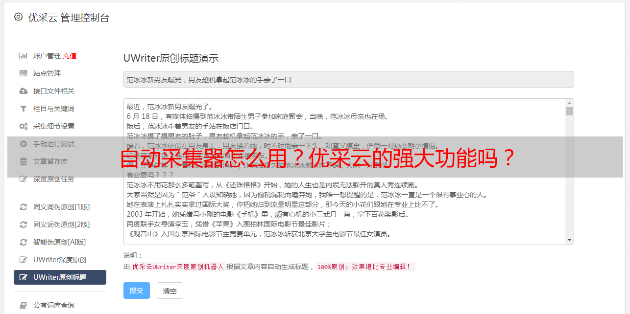 总之,使用优采云这一专业的SEO优化软件能够帮助用户快速准确地从Internet上采集数据并将其存储在本地电脑中。此外,它还能够帮助用户对所得到的数据进行详尽考察和有效优化。想要体验一下优采云的强大功能吗?不如就去它官方网站www.ucaiyun.com上注冊一下吧!