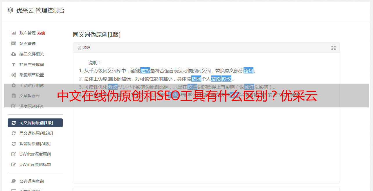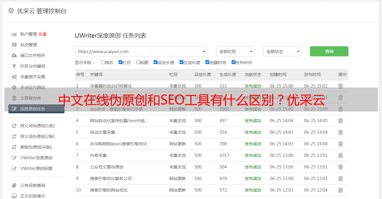 总之,优采云是一个十分方便实用的中文在线伪原创和SEO工具,它能够帮助用户快速高效地将原始文章进行重写和SEO优化。如果你想要尝试使用此工具来实现你所想要的目标,不妨前往www.ucaiyun.com来获取此软件。