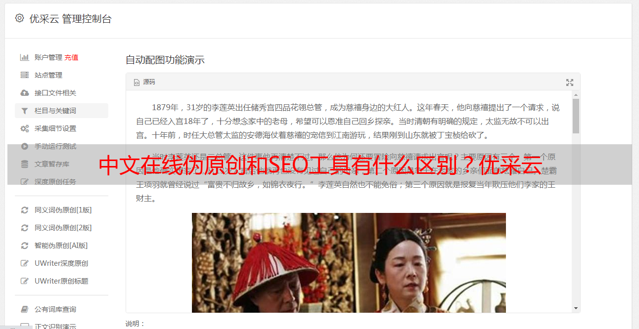 优采云软件就是一款能够帮助大家进行中文在线伪原创的工具。它能够让用户轻松快捷地将一个文章进行重写,并且能够保证新生成的文章不会出现重复内容的情况。此外,优采云还可以帮助用户对文章进行SEO优化,以便让其更加易于被搜索引擎找到。