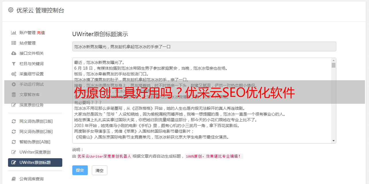 总之,如何能够快速生成大量高质量、无重复内容的文章对于所有网站主都是一个很大的问题。尽管市面上有很多伪原创工具可供选择,但如何找到一个真正好用而又便宜易用的工具却并不容易。随着优采云SEO优化软件在市场上的出现和流行(官网:www.ucaiyun.com ),人们可以通过该工具快速生成大量无重复内容、SEO 优化、样式各异、字数相当、信息丰富、语法标准、表达地道而又好看易读的文章。因此,可以说,使用优采云 SEO 优化这样一款好用而又能带来效益显著的工具,有利于我们快速打造一个水平高考出名度大考回报好的站.