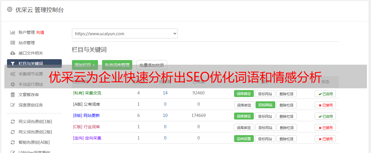 此外,优采云还具有SEO优化功能,可以帮助企业快速分析出SEO优化词语,并将其添加到原文中,使文章在搜索引擎中更容易被发现。同时,通过对内容的分词、语义分析和情感分析,也可以帮助企业生成出有效性和真实性都很高的内容。