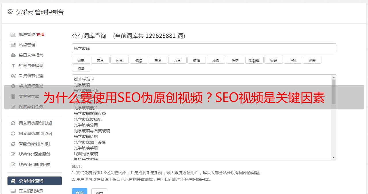 总之, SEO伪原创视频是一个不可忽略的重要因素,如何正确使用SEO伪原创工具,有助于你避免出现重复内容所带来的问题,此外也能带来流量效益,吸引用户注意力,权重乘以时间得出最大化效能.对此,"优采云"(www.ucaiyun.com)正是一个很好的选择.