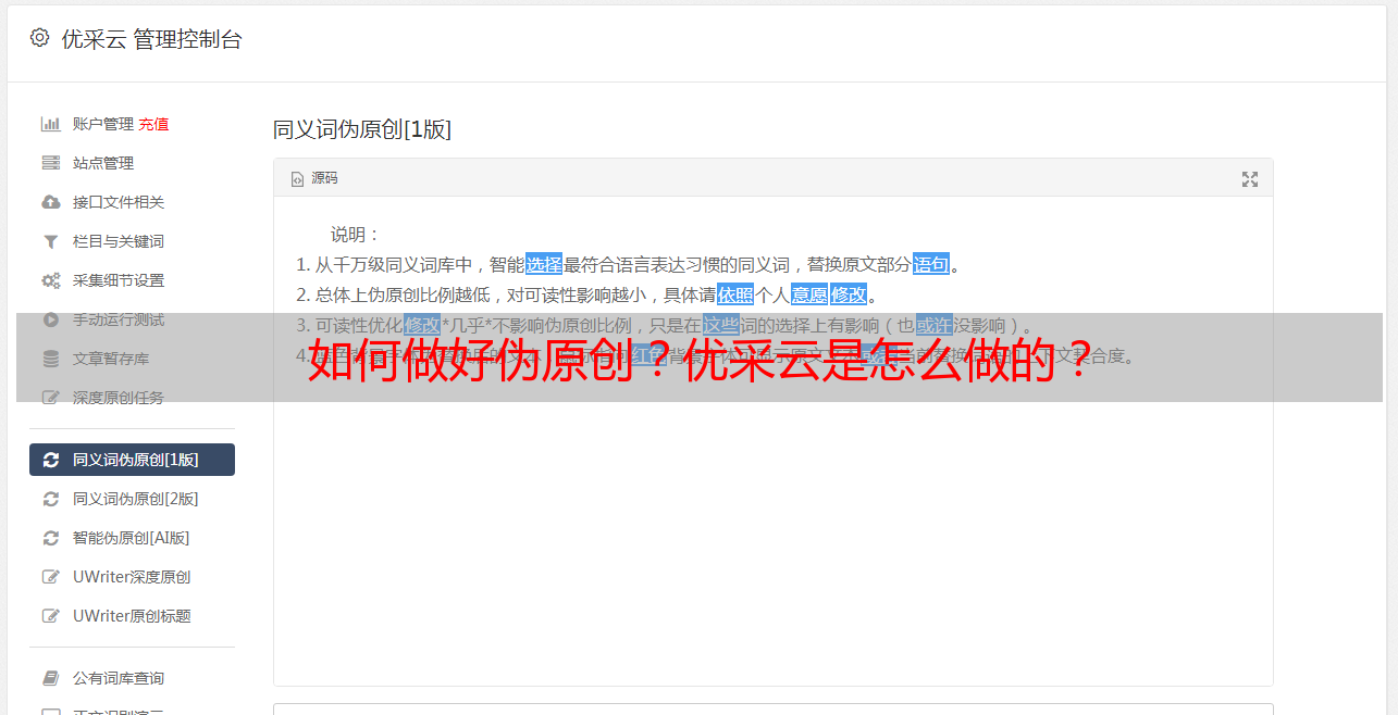 第三步是对文章进行伪原创处理。此时可以使用上述推荐的“优采云”软件来帮助用户快速处理文章。只需要将原始文章上传到软件中,然后根据需要进行修改即可。例如:将原始文章中出现的特定字词进行修改、将部分内容进行重复、将部分内容进行削弱或者加强等等。