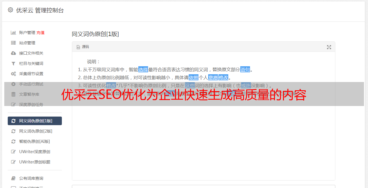 优采云SEO优化是一款功能强大的英文伪原创工具,可以有效帮助企业快速生成高质量、原创性强的内容。它可以将你的原始文本进行混淆处理,并将其改写成全新的文本,而不会影响原文章的意思。