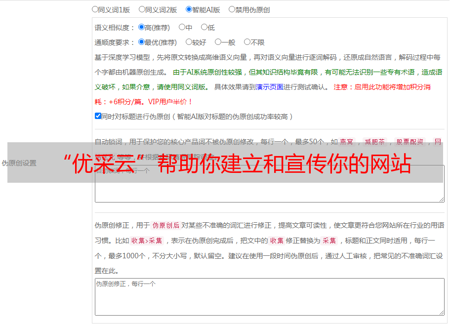 其中一款优秀的伪原创软件是“优采云”,它是一款强大的SEO优化软件,可以帮助用户快速生成高质量、高可读性的文章内容。它不仅能够帮助用户快速生成文章内容,而且还能够帮助用户将文章内容变得更有说服力和更加吸引人。此外,它还具有语法检查、单词补全、标题校正、文字数量校正、文字相似度校正等功能,为用户提供了全面的SEO优化服务。