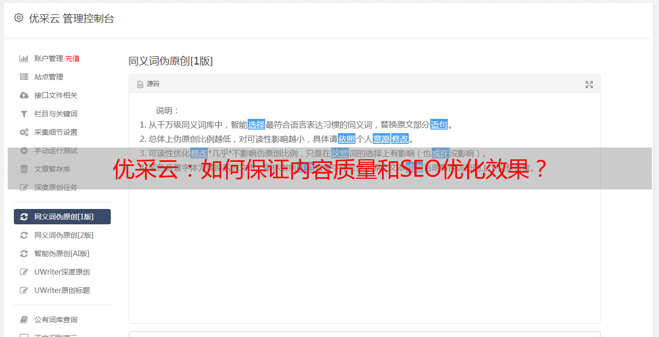 考虑到上述情况,如何保证内容质量和SEO优化效果就显得尤为重要。这时就可以使用优采云(www.ucaiyun.com)这样的文章伪原创软件来帮助企业快速生产大量有质量保证、SEO友好性强的文章。此外,该软件还可以根据用户需要对文章进行人工修改和增强,使得文章既能够吸引读者又能够具有一定的原创性。
