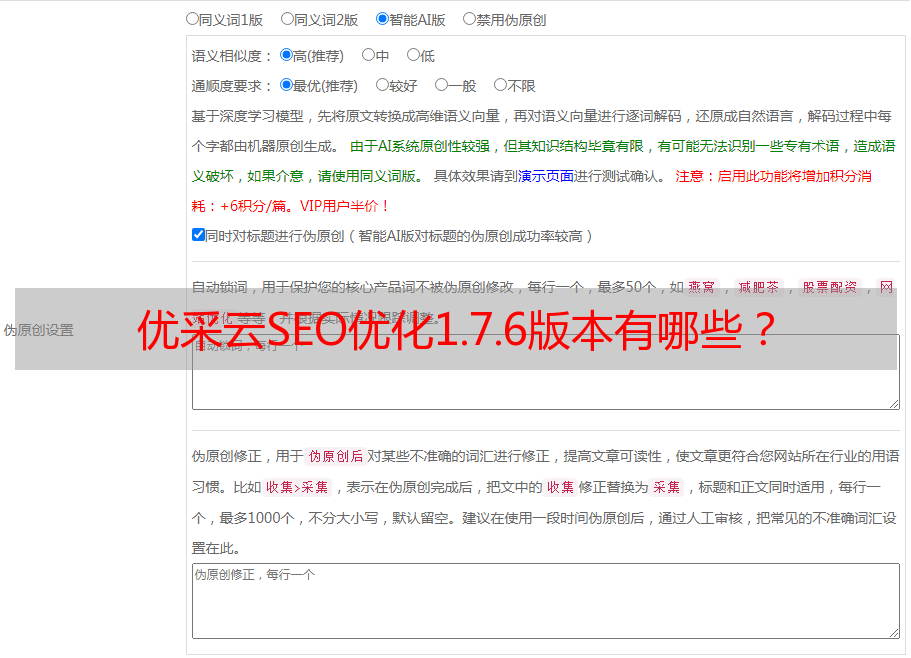 优采云1.7.6版本在原有功能基础上新增了伪原创工具,它能够让用户将原有文章内容进行无痕重写,从而达到原创效果。此外,它还可以帮助用户对文章中的关键词进行增强,从而使文章在搜索引擎中拥有更好的排名。在使用此软件时,用户也不必担心因此影响文章原有内容的逻辑性和流畅性,因为它具有非常强大的人工智能功能,能够根据原文进行合理的重写。