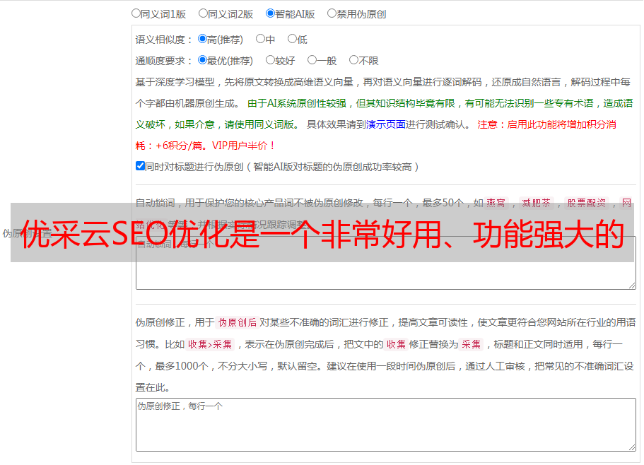 总之,优采云SEO 优化是一个非常好用、功能强大的SEO 优化工具。它不仅能够帮助用户快速、准确地进行伪原创工作,而且还能够保障用户数据安全。如果你正在寻找一个好用、功能强大的SEO 优化工具来帮助你解决SEO 优化问题的话,不妨试试看优采云SEO 优化吧!如有需要可以前往www.ucaiyun.com 进行咨询和购买。